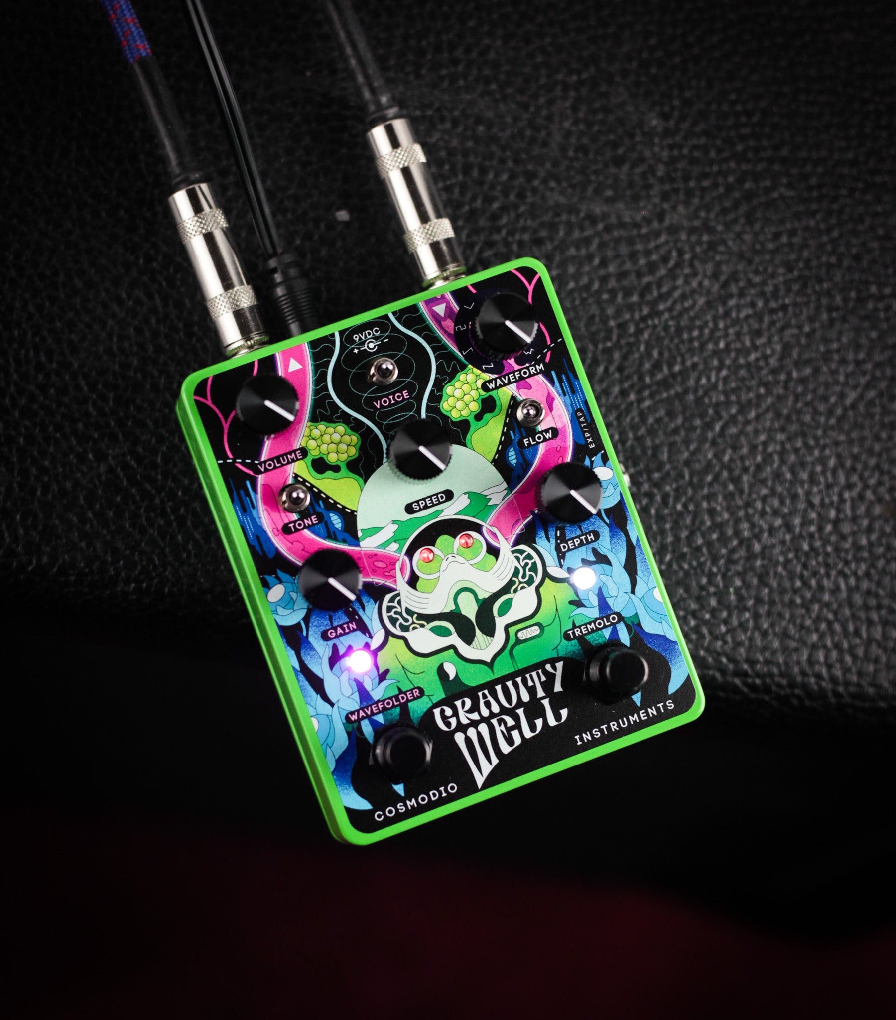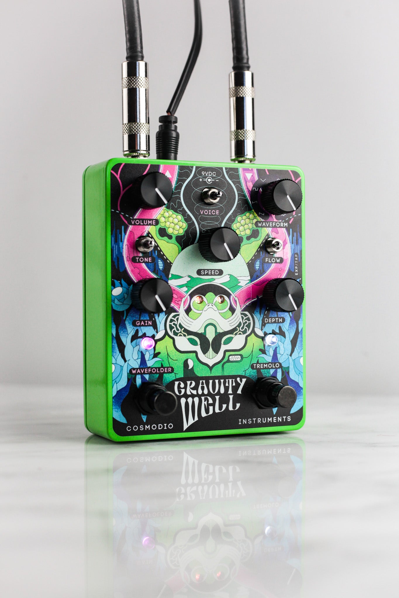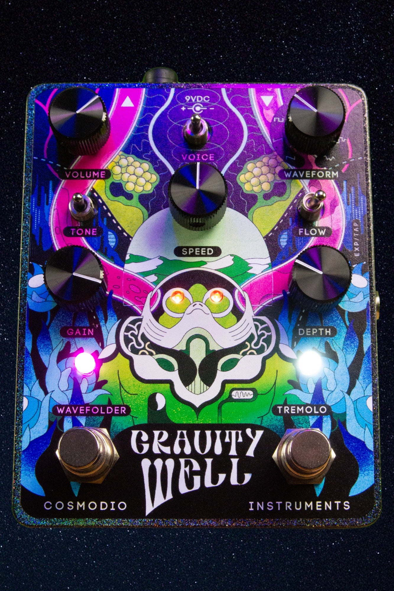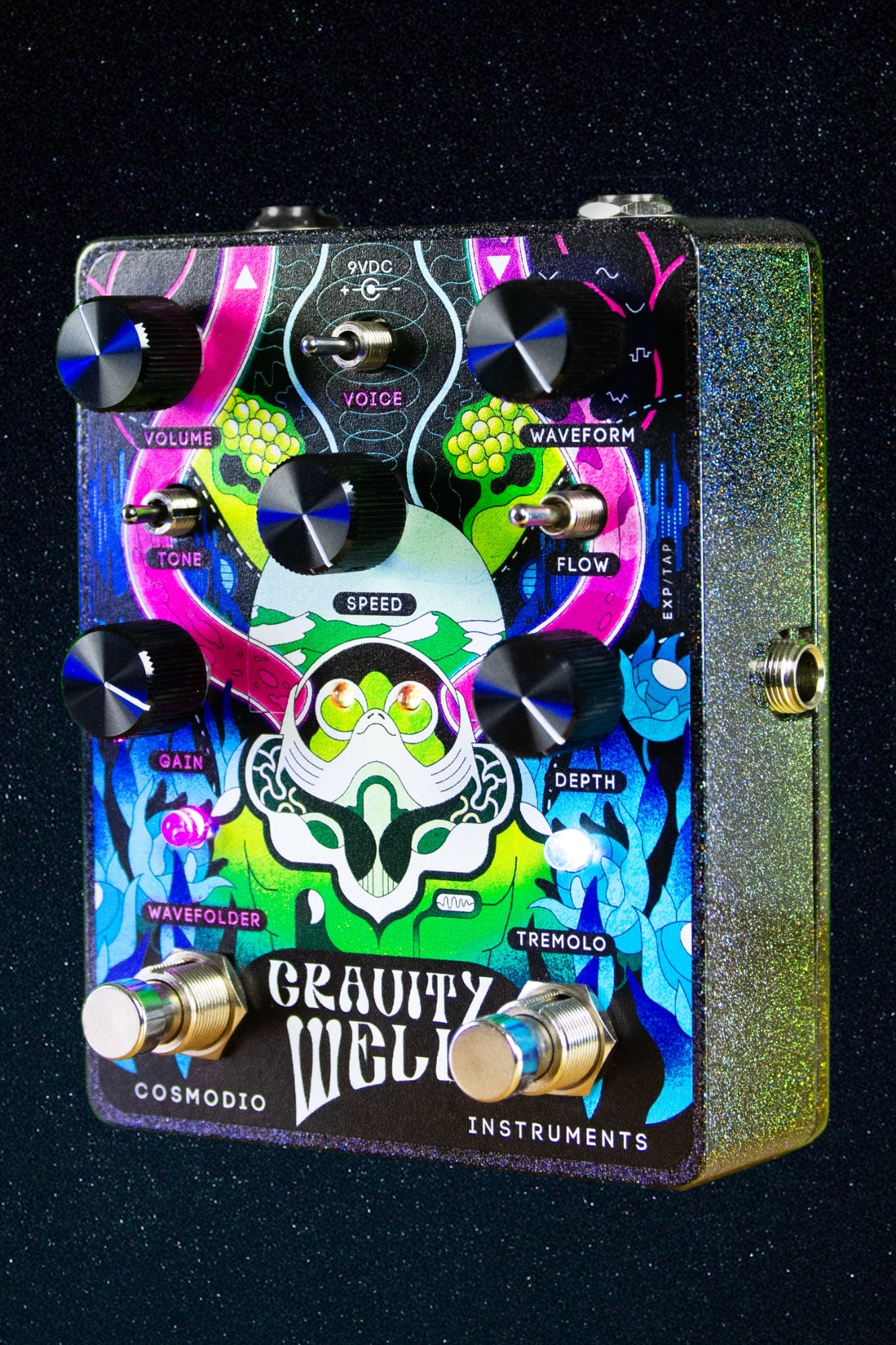 The Gravity Well analog tremolo/wavefolder/refractor is your sonic submersible for exploring subaquatic psychedelic netherworlds of sound. It's a dual pedal featuring a tremolo on one side and a wavefolder on the other. When both sides are active a third effect emerges, a refractor, a first-of-its-kind style of modulation effect produced by integrating the tremolo and wavefolder to rhythmically and fluidly warp and un-warp your signal, producing a dazzling variety of never-before-heard sounds and textures.