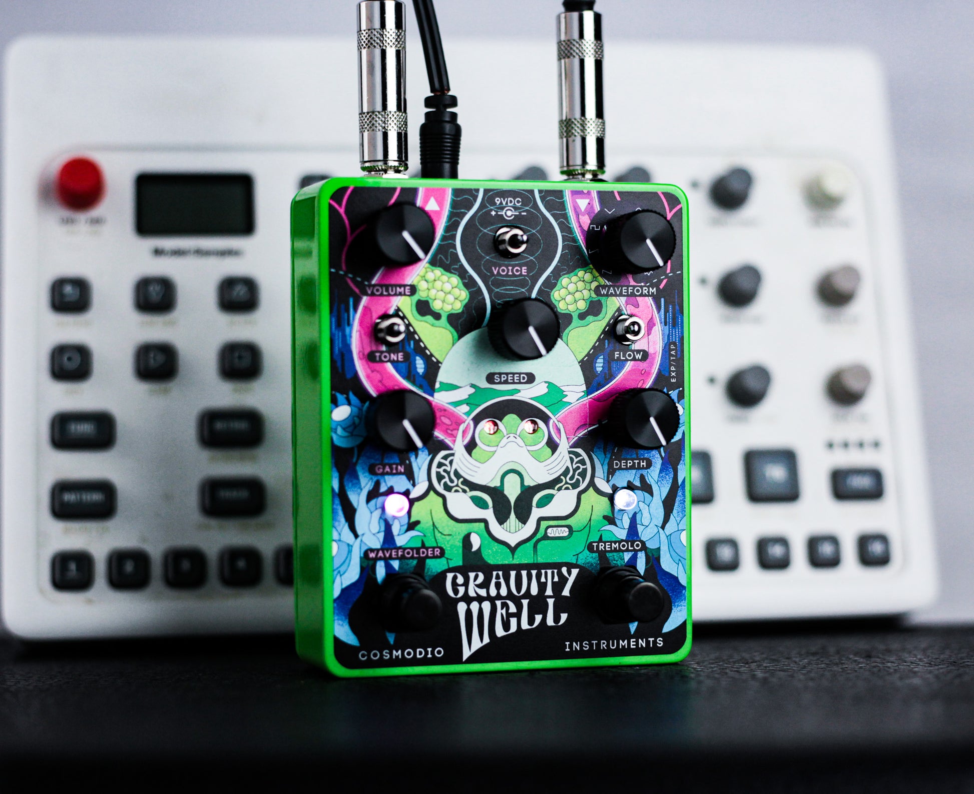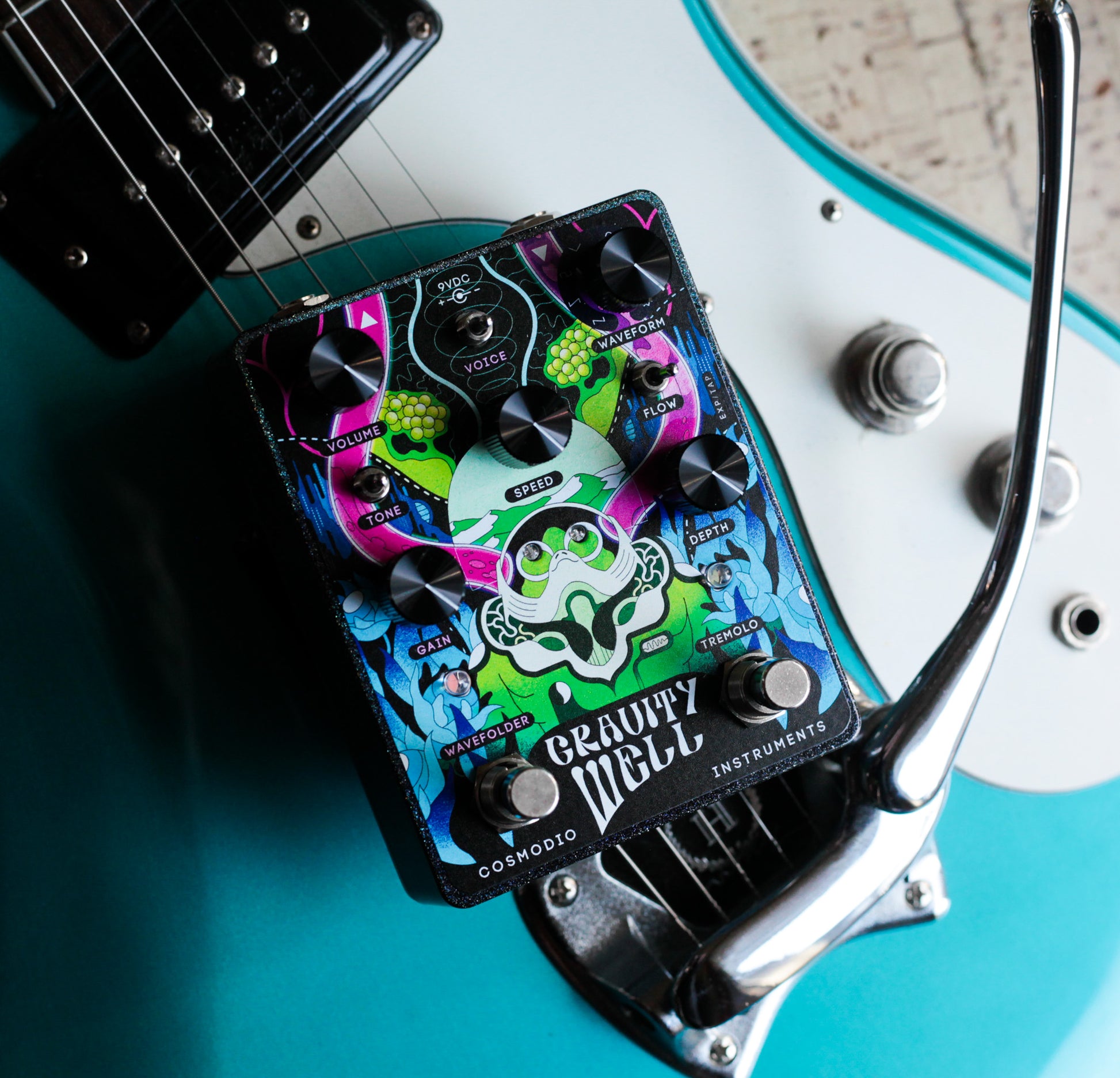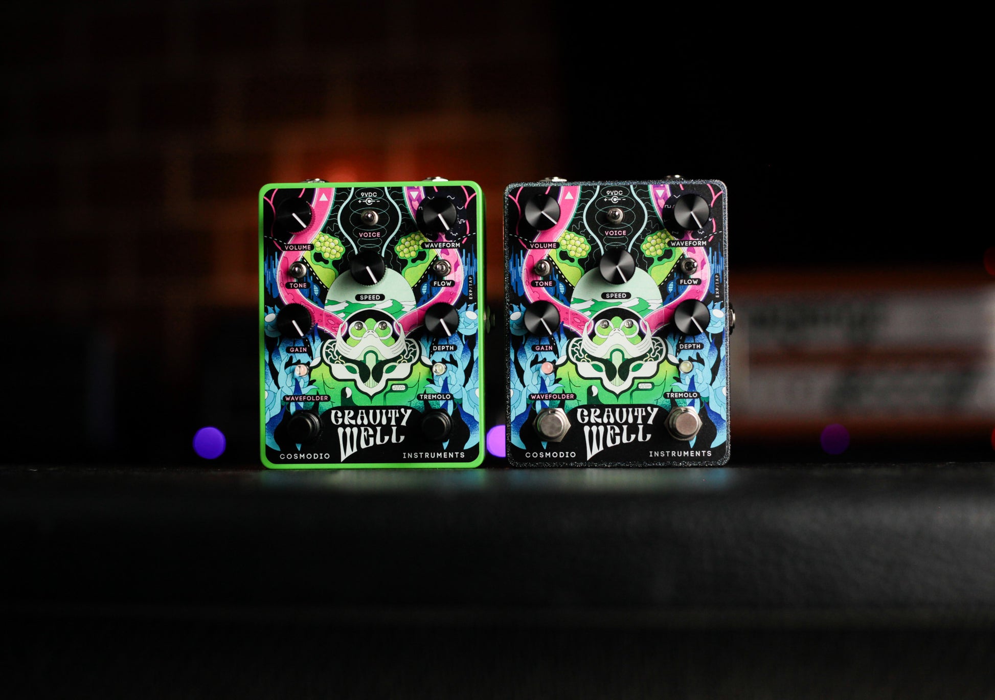 The Gravity Well analog tremolo/wavefolder/refractor is your sonic submersible for exploring subaquatic psychedelic netherworlds of sound. It's a dual pedal featuring a tremolo on one side and a wavefolder on the other. When both sides are active a third effect emerges, a refractor, a first-of-its-kind style of modulation effect produced by integrating the tremolo and wavefolder to rhythmically and fluidly warp and un-warp your signal, producing a dazzling variety of never-before-heard sounds and textures.
