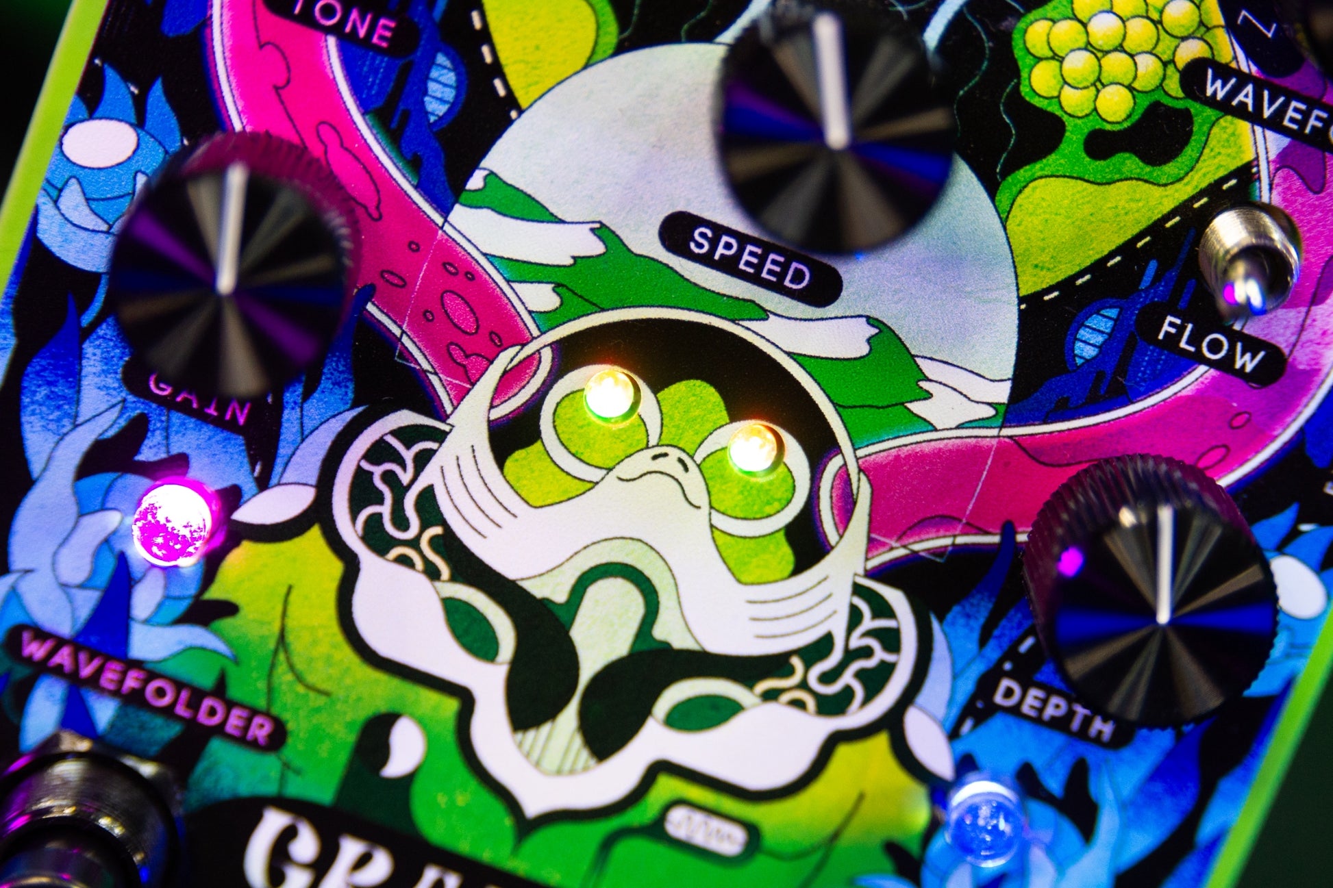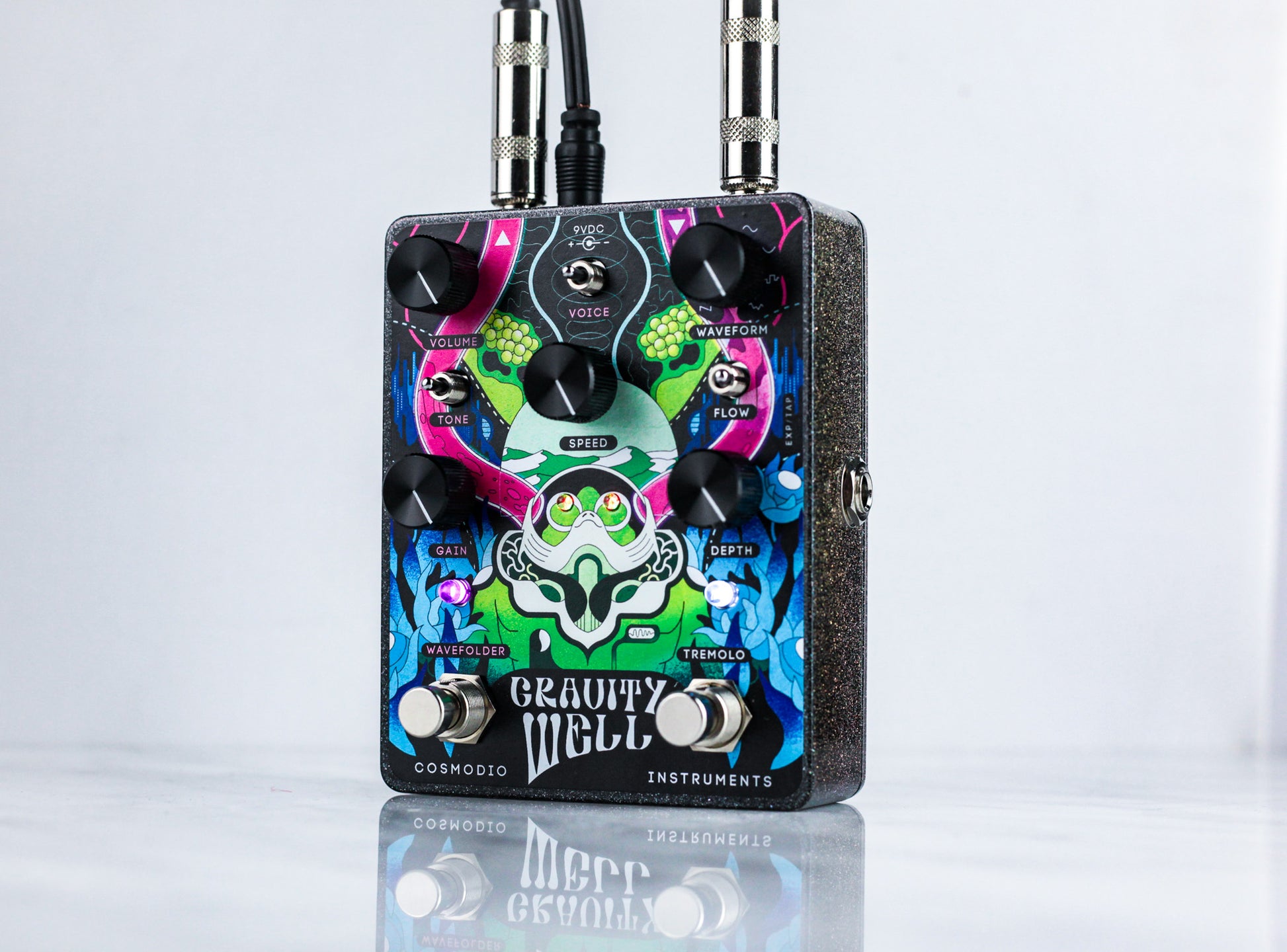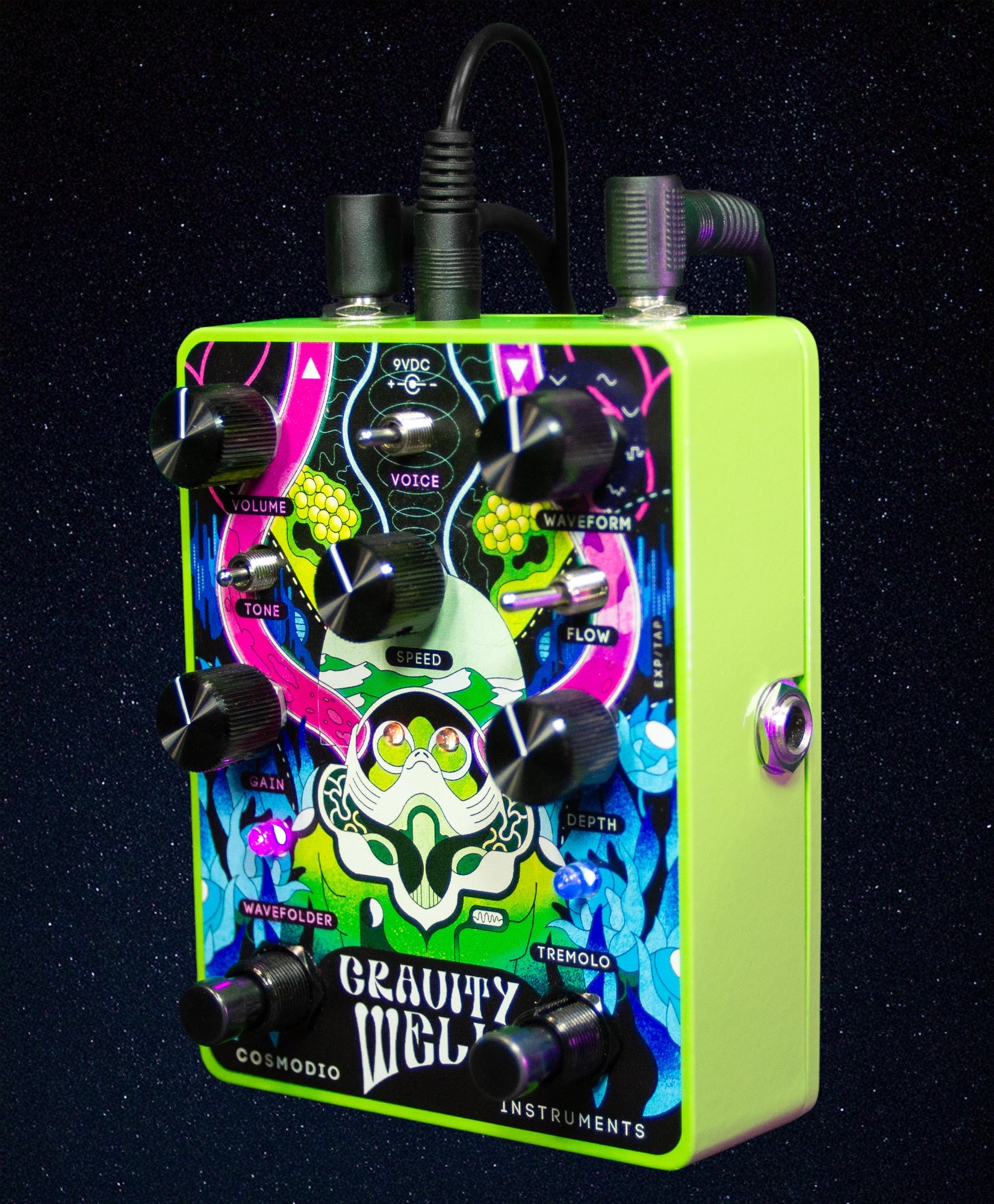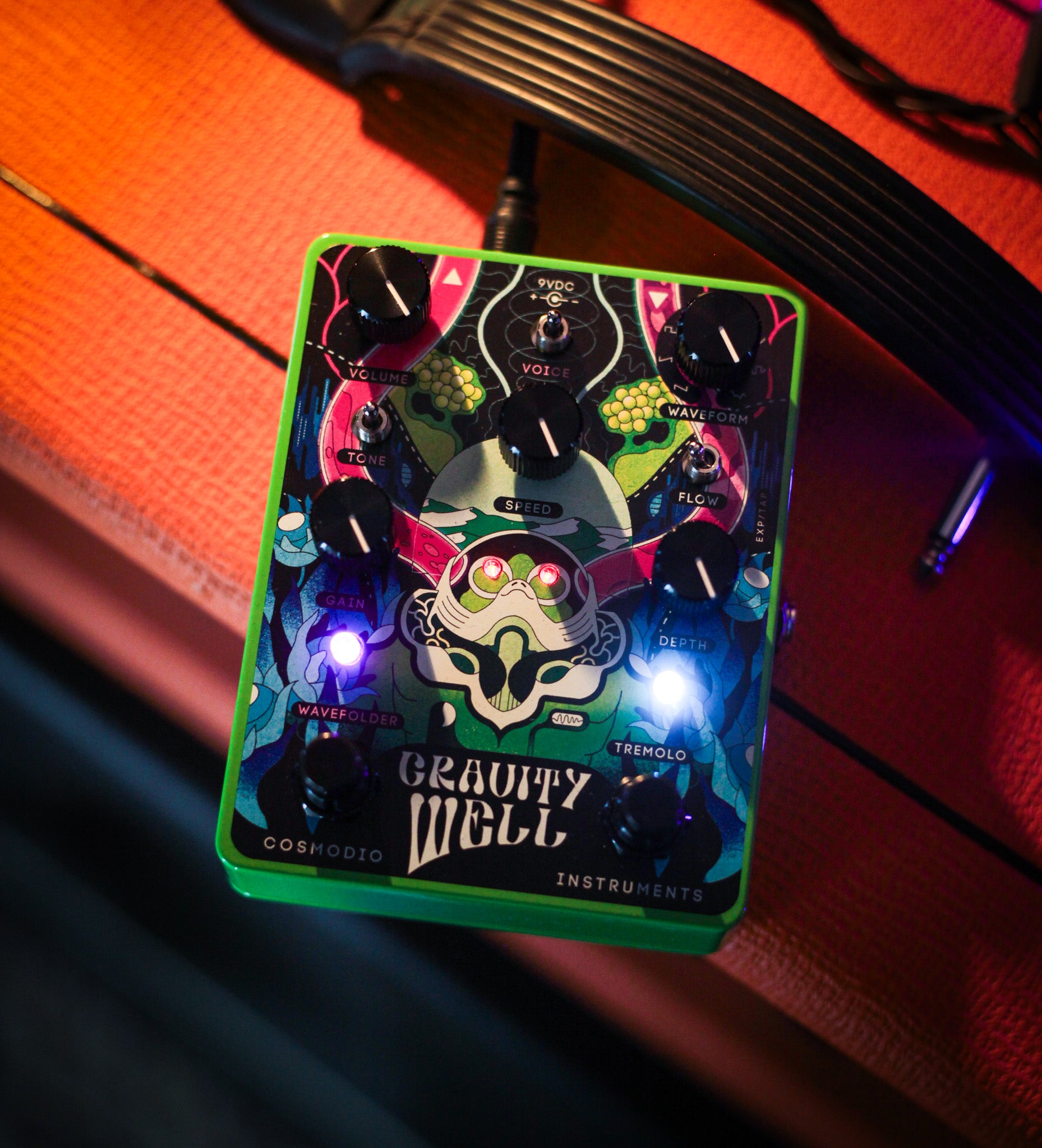 The Gravity Well analog tremolo/wavefolder/refractor is your sonic submersible for exploring subaquatic psychedelic netherworlds of sound. It's a dual pedal featuring a tremolo on one side and a wavefolder on the other. When both sides are active a third effect emerges, a refractor, a first-of-its-kind style of modulation effect produced by integrating the tremolo and wavefolder to rhythmically and fluidly warp and un-warp your signal, producing a dazzling variety of never-before-heard sounds and textures.